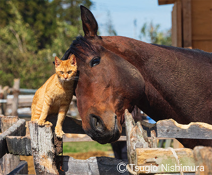 仲良しのサラブレッドと猫、顔を寄せ合いうっとりとしたサラブレッド。