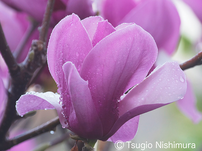 早朝の雨上がり、フラットな光に包まれたシモクレン(紫木蓮)別名モクレン、雫をまとった花びらに写欲をかき立てられレンズを向ける。花言葉は「高潔な心」。